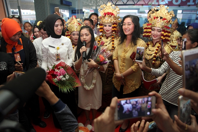 Gadis asli Kota Prabumulih Provinsi Sumsel disambut langsung Kadisbudpar Sumsel Irene Camelyn Sinaga dan Kadiskominfo Sumsel Inanda Karina Astari Fatma.