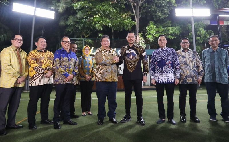 airlangga dan AHY dengan didampingi para pejabat partai masing-masing, berfoto bersama penuh semangat.